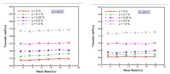 Figure 10 shows that viscosity behavior does not depend on the shear rate in temperatures of 35 °C and 65 °C in various volume fractions. The results at different volume fractions show no significant changes in the viscosity behavior of the nano lubricant. However, increasing the temperature from 35 °C to 65 °C resulted in decreased viscosity of the nano lubricant.