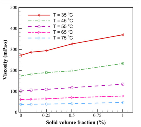 The highest viscosity is observed at the lowest temperature and the highest volume fraction. At elevated volume fractions and by adding graphene oxide nanoparticles to the base fluid, the flow resistance increases, i.e., the nanoparticles collide more with each other when moving randomly. The viscosity increases by increasing the volume of nanoparticles in a constant quantity of oil and the presence of Van der Waals force. This physical structure of the nanoparticle hinders the layers from moving on each other, consequently raising the viscosity.