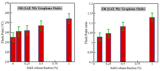 The flash point is the lowest temperature at which oil turns into steam and forms an explosive mixture with air. At near the flash point, the oil ignites instantly and then goes out. Therefore, the flash point of an oil is a determining parameter for the temperature conditions of the oil. These physical properties are a measure of the degree of ignition and volatility of the oil. The addition of graphene oxide nanoparticles with different volume fractions improves the oil performance for very hot temperatures, which increases the range and operating conditions of the oil. The results are presented based on the volume fraction function in Figure 13. At best, the flash point of the nano lubricant improves by 8% compared to the base oil. The flash point increases from 235 °C to 254 °C. The addition of nanoparticles, even with a low volume fraction, can positively influence oil performance.