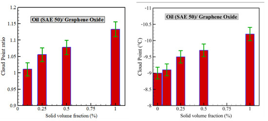 The allowable limit for using the oil in extremely cold temperatures is highly critical. In ICEs, the oil and engine temperatures are at their lowest level in the first. In this case, the system is at its lowest temperature and the maximum wear occurs if the lubrication system does not operate properly. The cloud point results, as well as the ratio of variations in the nano lubricant are presented in Figure 14. According to experimental results, when the oil temperature cools and a cloudy layer or halo of paraffin crystals forms inside it, the nano lubricant will perform more efficiently. At this temperature, nano lubricants do not easily lose their fluidity and can yet be applicable. The best conditions are created for the nano lubricant at the highest concentration and the rate of changes increases up to 13.3%. By comparing the results of this research with the previous one, it seems that Graphene oxide nanoparticles are more efficient; for instance, [19] reported by using 1.5% ZnO nanoparticle, the cloud point increased about 12%. In addition, we achieved a better result compare to Esmaeilzadeh et al. [31], but they used higher volume fractions and could find lower cloud point.