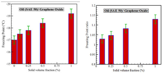The freezing point of the nanoparticle was investigated under various volume fractions and the results are shown in Figure 15. The results show that the base oil reaches the freezing point at −17 °C. By adding nanoparticles to the oil, the freezing temperature of the oil increases. Nanoparticles exert beneficial effects. Positive variations are visible at the base oil, even in very low volume fractions. The lowest freezing temperature is related to the maximum volume fraction and its value is equal to −19 °C. The results of the ratio of variations in the nano lubricant to the base oil show that the variations in the volume increase more and more with rising the volume fraction. Improving this parameter prevents the oil from freezing in negative weather conditions because the range and conditions of using this nano oil are more than the base oil.