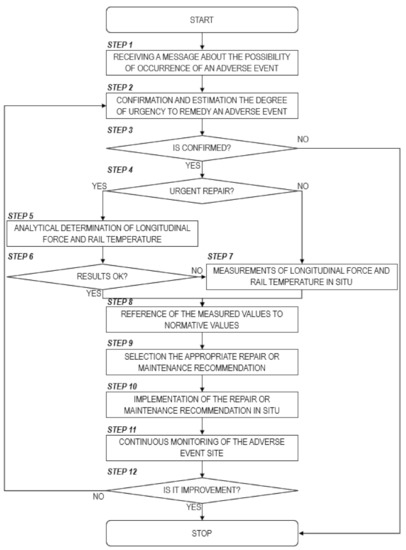 - Step 12: the infrastructure manager’s unit responsible for continuous welded track maintenance establishes whether the implemented recommendation has had a positive impact; if so, the procedure ends, otherwise proceed to step 2.