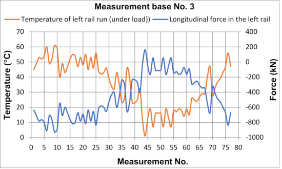 Results of measurements of temperature and longitudinal force of left rail after loading by a passing train—measurement base No. 3 (source: own work).