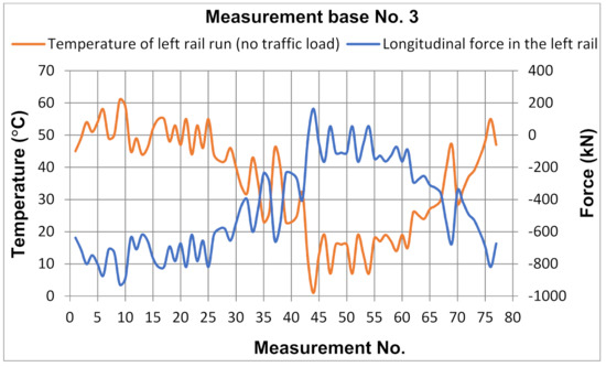 Results of measurements of temperature and longitudinal force of left rail without load of a passing train—measurement base No. 3 (source: own work).