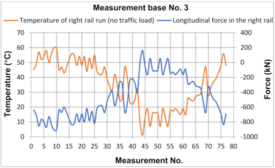 Results of measurements of temperature and longitudinal force of right rail without load of a passing train—measurement base No. 3 (source: own work).