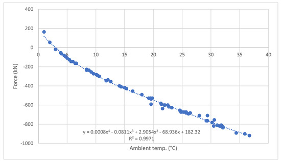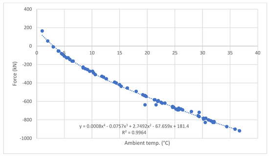 A graph of the dependence of longitudinal force of the rail under load on ambient temperature is shown at Figure 14.