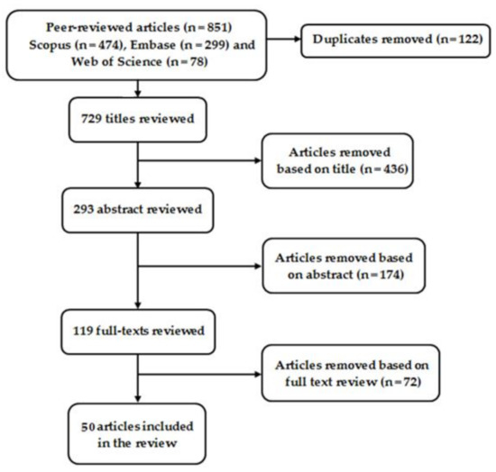 To retrieve articles from 1 January 2000 until 20 January 2021 related to hydrogen production in the catalytic dry reforming of hydrocarbons according to the PRISMA guideline, searches were performed in the Scopus, Embase, and Web of Science databases [24,25]. The following keywords were included: “hydrogen”, OR “H2” OR “hydrogen production” OR “H2 production” AND “reforming”, OR “dry reforming” OR “catalytic reforming” OR “catalytic dry reforming” OR “dry reforming of hydrocarbon” OR “dry reforming of methane” OR “DRH” OR “DRM”. Initially, 851 articles were acquired. Then, based on a screening of titles and abstracts, 119 articles remained for full-text assessment. In the next stage, based on full-text evaluation, 50 articles with 100 cases regarding the utilization of hydrogen production in catalytic dry reforming of hydrocarbons and alcohols for data extraction were extracted (Figure 1, Table S1).