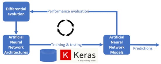 After the models were trained, the testing data were used to determine the generalization capability of the models. These results were then loaded into DE, which modified the architecture and re-applied the training process. The architecture modification in the DE algorithm was performed for each model by repeating the following steps: mutation, crossover, and selection for several generations. In the mutation phase, the current population of encoded ANNs was mutated through a differentiation process. The characteristics of the resulting individuals were combined with the characteristics of their corresponding individuals from the current population in a process called crossover. This new set of ANNs (trial population) was trained with the Adam approach and then evaluated to determine its fitness. In the next step, selection, the individuals with the best fitness from the trial and current population were selected to form the new population to undergo the evolutionary process. More details about DE can be found in the annotated sources [28,37,38]. As the changes performed by DE are small, when transforming the encoded data into an ANN architecture, due to the discrete property, there is the possibility that over the generations, the architecture will remain unchanged. When this happened, the corresponding trained model from the previous generation was loaded and further trained. In this manner, the performance of these models was improved.