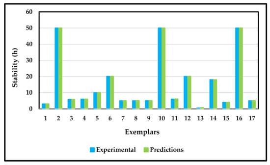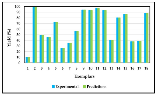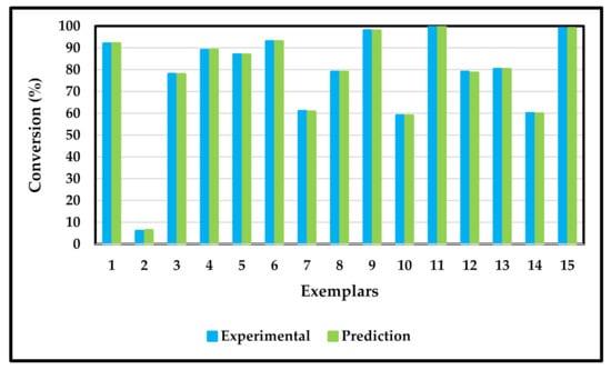 For the testing data, the ARE of the best models obtained for conversion was 0.52%, for stability 3.36%, and yield 0.03%. In all the cases, the ARE was lower than 5%, indicating that the obtained models have a good generalization capability and can be efficiently used to determine the potential behavior of other combinations for the considered independent parameters. A comparison between the predictions and the experimental data in the testing case is presented in Figure 3 for conversion, Figure 4 for stability, and Figure 5 for yield. These results indicate that the determined models can be further used to generate predictions and/or for process optimization. To this end, the best models are publicly available at https://bit.ly/3b22YQc (accessed on 4 May 2021)and can be loaded using the load_model function from the Keras model library. After loading, without further training, the models can be used in various scenarios, and combinations can be pointed out as suitable for further analysis and experimental study.