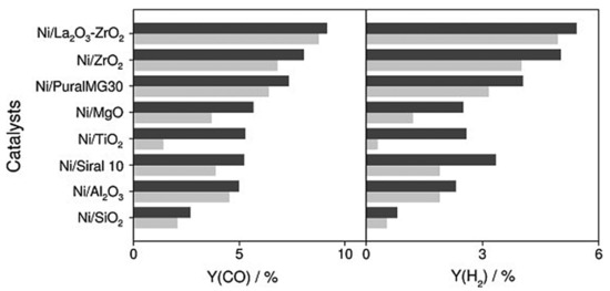 The active metal is usually used as a supporting material for catalysts in dry reforming. These supports maximize the active sites by providing a wide area that increases the stability and yield of the process. In recent years, various supports such as MgO, ZnO Al2O3, SiO2, and ZrO2 have received special attention in catalytic dry reforming. To comprehend the impact of the support materials on stability and yield in catalytic dry reforming, Sokolov et al. employed a series of supported Ni catalysts in dry reforming of methane. In this study, N-based catalysis with Zr support showed a higher yield and stability than those of other supports (Figure 6) [44]. The reason for this can be attributed to high thermal stability, high surface area, and high relative activity for N-based catalysts with Zr support. Similar results were obtained in the present study, for example, Exemplar 4 in Figure 4 and Exemplars 11 and 12 in Figure 5.