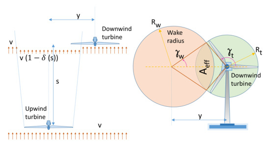 The previous expression can be easily modified to account for the situation in which the downwind turbine is only partially affected by the wake. Figure 2 illustrates this situation that allows the calculation of the effective surface of the downwind rotor affected by the upstream weak (Aeff) once the projection s and the transversal separation between turbines (y) are known.