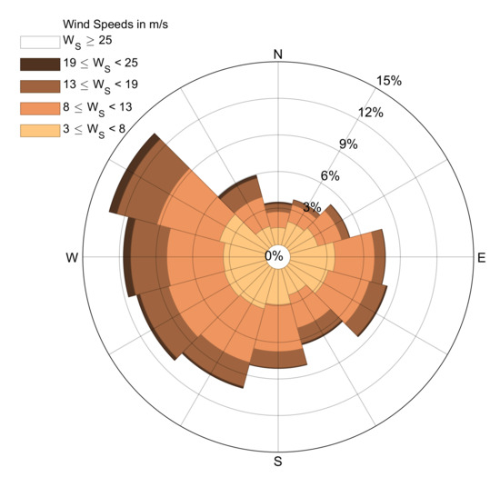 In the case of HR-I, several sources can be found with different values, although they share the existence of a prevailing wind coming from NW. This work will use the ones obtained from [36], represented in Table 1, resulting in the wind rose of Figure 3.