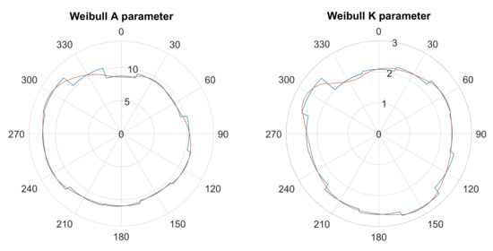 This procedure can be applied to Weibull parameters, starting from their mean values for each of the sectors. Figure 4 shows the original discrete values for the Weibull parameters, together with their obtained continuous distributions.