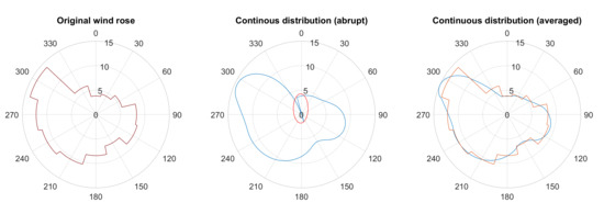 Continuous interpolation of a wind rose. Left: Original wind rose for twelve sectors. Center: continuous distribution with abrupt edge from NNW to N. Right: original wind rose compared to an averaged distribution.