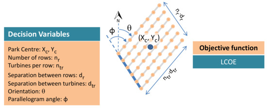 The aim of the WFOP is to obtain the optimal position and layout for an OWF in the concession area, such that it optimizes a certain objective function, which in this work is the LCOE. Unlike almost all of the articles reviewed, it does not seek to position each of the turbines independently [5,6,7,9,10,11,12,14,26,27], which would lead to irregular layouts. Instead, in this work, the individuals of each generation are parallelogram-shaped OWFs in which the turbines are evenly distributed. It is defined by the following 8-tuple: coordinates X and Y of the centre; number of rows (nr); number of turbines per row (ntr); distance between rows, in diameters (dr); distance between turbines in a row, in diameters (dtr); orientation of an array with respect to North, in deg, sense CW (θ); parallelogram angle; equal to 90 deg for rectangle (ϕ). Figure 6 represents these decision variables.