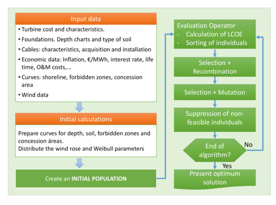 Kirchner-Bossi [4] uses two GA parametrizations to determine the position of the turbines that optimize the energy produced, assuming that the turbines are restricted to the area occupied by Horns Rev I (HRI) and for Princess Amalia. Gao et al. [5] presented a multi-population genetic algorithm for a case study optimization applied to an offshore wind farm in Hong Kong. A similar study was also performed by Pookpunt and Ongsakul [6], in this case for an offshore wind farm in Thailand, by means of a binary particle swarm algorithm. Chowdhury et al. [7] introduced a particle swarm algorithm to optimize the location of wind turbines and considered different wind conditions over the study area. Furthermore, a particle swarm optimization algorithm was proposed by Hou et al. [8] to address the design of large offshore wind farms. Salcedo et al. [9] relied on a novel coral reef algorithm with the objective of maximizing the output of offshore wind projects. Feng in [10] uses a random search algorithm to maximize the power production in HR1. A hybrid method based on a genetic algorithm (GA) combined with local search was proposed by Mittal et al. [11]. A newly reported mutation operator was developed by Mayo with the objective of maximizing energy yield [12]. In a similar way, but referring to large wave farm consisting of fully submerged wave energy converters, Neshat et al. [13] use different approaches to evolutionary algorithms to maximize the harnessed power. Five of the approaches fall into the group of continuous methods, like the one used in the present work, and four of them in that of the discrete methods, of which GAs are its greatest exponent.
