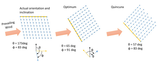 However, few research papers have been found discussing whether the choice of orientation and inclination of the concession area was appropriate. Gerdes in [20] stated that the turbine spacing was chosen as 560 m both between rows and along a row (equivalent to seven rotor diameter of the upwind turbine (D)), based on a wide wind direction distribution that revealed no clear preferable orientation and demanded an equal-distance spacing for both wind farm axes. The report [21] exposed that the modeled wake losses varied by only 0.11% over the full range of grid rotation, which was relatively unimportant in determining the total plant losses.