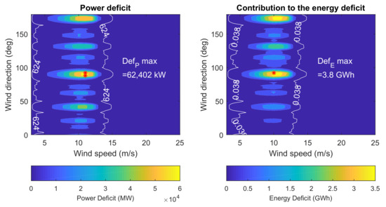 where is the cut-in speed, is the cut-out speed, is the electrical energy at a certain wind speed given by the turbine power curve and is the density of probability at speed and wind direction . In this expression, the power produced by a turbine k of the array depends of the effective speed of the air flow that reaches the k-th turbine, . Due to the wake effect, this effective speed is smaller than the free-flow air speed u. There are different methods to estimate the wind speed deficit caused by the wakes.