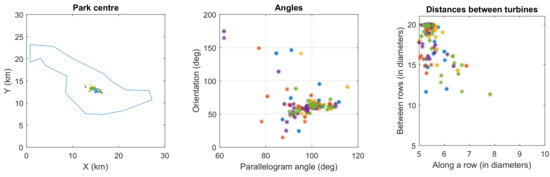 Despite this, little work has been done to limit solutions to OWFs with evenly distributed turbines [15,16,17,18], which is a solution that is increasingly being adopted by designers of real OWFs. Among them, parallelogram-shaped wind farms are a particular and frequent case. In cases with a very limited concession area where the optimal solution will hardly have a regular shape, Serrano et al. in [15] uses a search algorithm for a parallelogram-shape solution to determine the distance between turbines, orientation and angle of the parallelogram that maximize energy production. Neubert in [16] uses a deterministic algorithm to investigate a discrete number of cases with the motivation of achieving an appealing visual impact and presumably reduce the infrastructure cost for cables. Feng in [17] uses a parallelogram shape solution in a first stage of the WFOP to deduce the best orientation and shape of the OWF, before performing the complete layout optimization. Finally, Stanley in [18] uses five parameters to define the solutions bounded in a concession area with the benefit of reducing the computational expense. For other renewable sources, a continuous exploration of the position and orientation of a solar array is presented in [19].