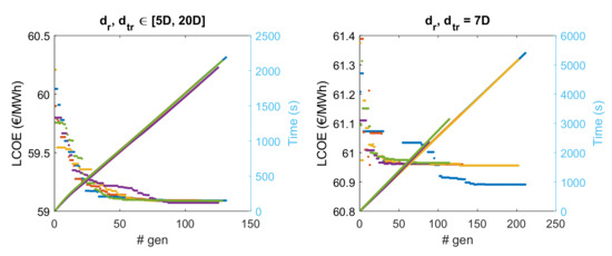 A value of 58 €/MWh can be assigned to the energy price, as the sum of the feed-in tariff and the market price (at least during 10 years) [20,30]. Nevertheless, with this energy price, profitability is doubtful. As a consequence, LCOE has been chosen instead of NPV or IRR as a objective function, since this indicator does not depend on the energy price.