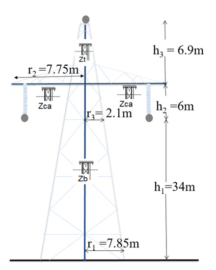 The tower structure and geometry are mostly site-dependent factors and have a minute impact on the simulation results [22]. Each major section of the ±500 kV HVDC tower is modeled in Figure 2, as a combination of four short transmission lines using FDPM.