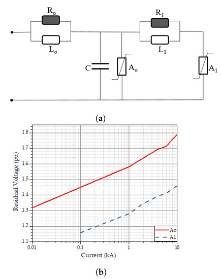 Frequency-dependent metal oxide surge arrester: (a) Model. (b) VI characteristics of the nonlinear resistances.