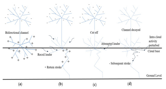 Illustration of a bipolar lightning stroke event. (a) A bidirectional flash start developing inside the cloud, which has accumulated negative charges on the upper side of the cloud and the positive charges at its base. (b) A positive return stroke to a grounded object takes place; when in the lower end of the cloud, recoil leaders form a dense positive lightning tree. (c) After this incident, the bidirectional flash is cut into half. (d) The subsequent stroke of the negative polarity is caused by the attempted leader, which is formed when the inactive recoil leader outside the cloud comes into contact with the active recoil negative leader in the cloud.