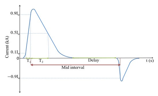 Lightning strokes are modeled conventionally as current sources. Two Hiedler functions [29] have been used to simulate two strokes of bipolar lightning sequentially, as given by Equation (11):