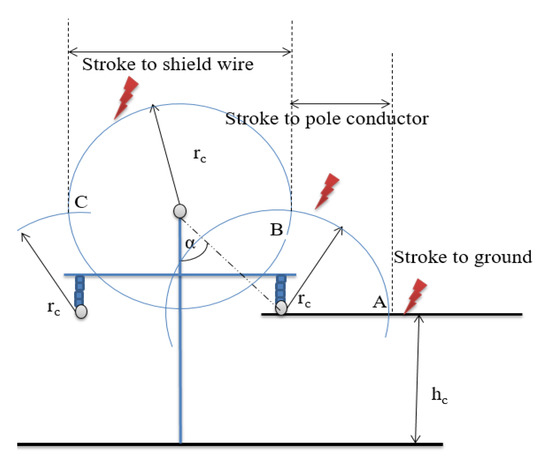 OHGW provides a shadow over the pole conductors for the sake of protection against lightning strokes in proximity of the transmission line. However, lightning strokes of comparatively lesser magnitudes bypass the shielding wire and hit the underneath conductor. This phenomena is illustrated in Figure 6 in which A, B and C represent the names of imaginary circles to better illustrate the concept behind attractive radius.