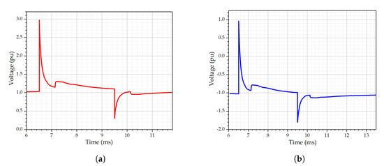 is the shielding angle, the constants X and Y take values of 10 and 0.65, respectively, is the conductor height in m, and is the ground wire height in m. As a result of SF, when the bipolar stroke hits the positive OHPC of the transition tower; overvoltage increases up to 3 pu due to the first stroke, and minor polarity reversal is seen due to the subsequent stroke, as shown in Figure 7a. In the case of a bipolar lightning stroke to the negative pole, critical voltage polarity reversal can be seen as in Figure 7b due to the first stroke, while the subsequent stroke causes overvoltage.