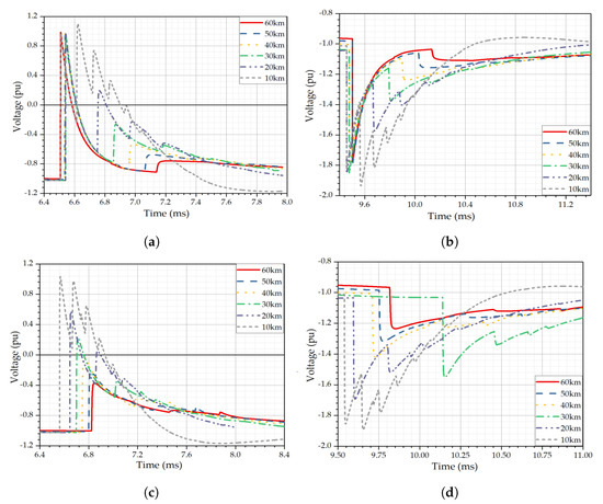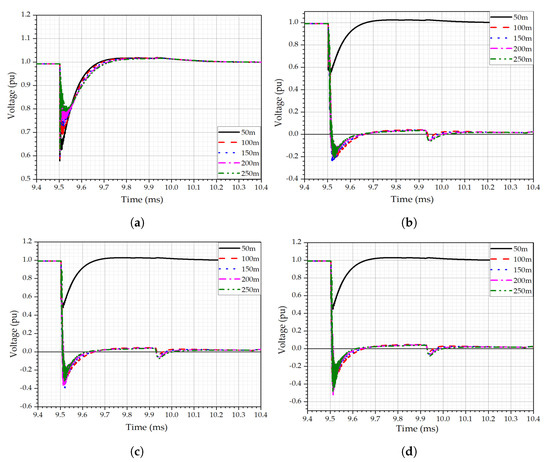 These reflected waves will attenuate the voltage stress at the lightning strike location, which is at the adjacent tower and will prevent insulation failure. Similarly, despite the varying riser section lengths, no ground fault occurred with a smaller footing resistance of the adjacent tower, as depicted in Figure 13a; the length of the cable is kept constant at 40 km in this case study, due to which the tail of waveforms seem to be constant. However, BFO will occur inevitably in cases where the riser section length increases along with the footing resistance of the adjacent tower; both of these sufficiently reduce the magnitude of the reflected waves and cause BFO, as shown in Figure 13b–d.