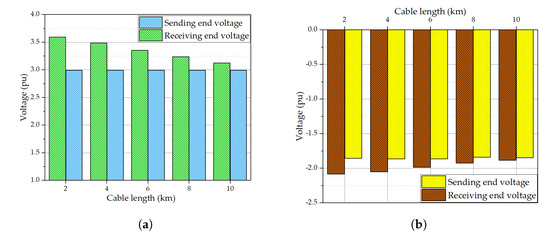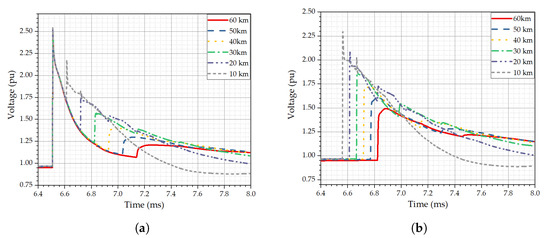 Pole-to-ground overvoltage at the cable terminals with varying cable lengths: (a) Over voltage due to the first stroke at the positive pole. (b) Over voltage due to the subsequent stroke at the negative pole.