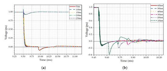 Figure 12a shows the positive pole voltage of the cable at its sending end due to the BFO at the subsequent tower. Multiple backward reflecting waves from the surroundings of the subsequent tower contributed to its BFO. These include four major opposite polarity reflected waves: one from the base of the incident tower itself, two from the base of the neighboring towers (left and right) of the incident tower, and one from the cable entrance when the riser section lengths are shorter than 200 m. In the case of riser section lengths greater than 150 m, no BFO occurred mainly because the reflection from the cable entrance died down by the time it reached the subsequent tower due to the larger distance between the lightning stroke location and cable entrance.