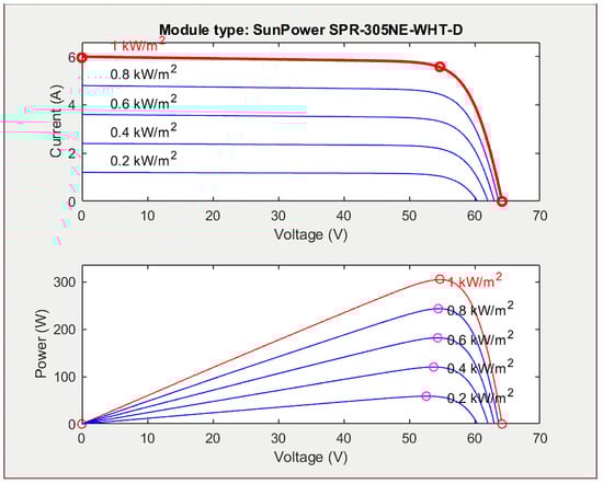 The electrical parameter specifications of the SunPower SPR-305NE-WHT-D modules used in this simulation are presented in Table 1. MATLAB software was used to simulate the characteristic output curves. Figure 1 shows the simulated P–V and I–V characteristic curves of a photovoltaic module in standard test conditions (irradiation: 1000 W/m2, air mass: 1.5 and temperature: 25 °C) without shade or with different percentages of shade.
