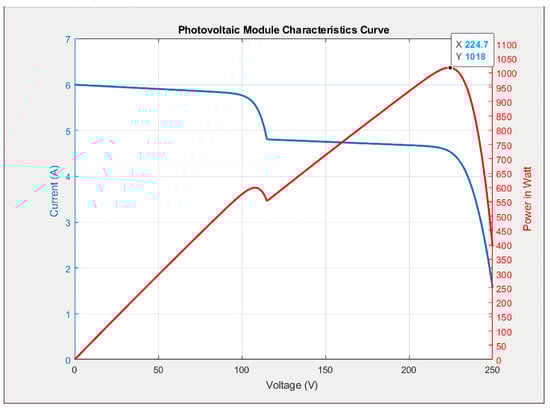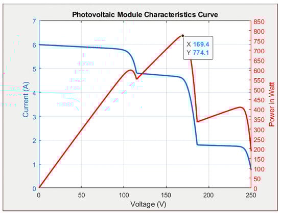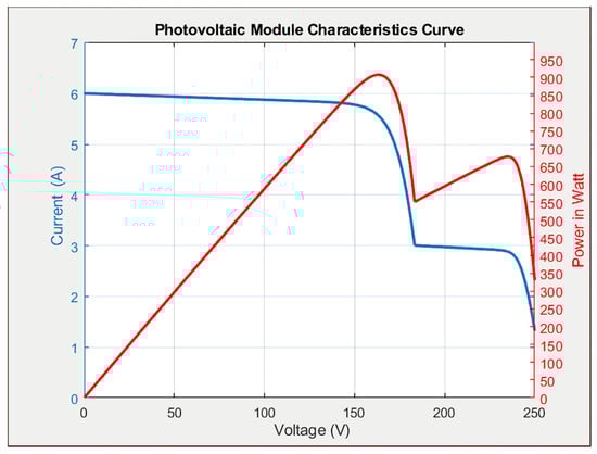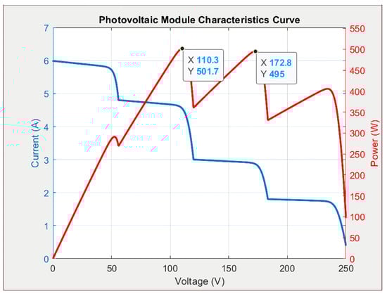 Figure 2 illustrates the P–V and I–V characteristic curves of a four photovoltaic module array with one module under 50% shade. Consequently, two peaks appear in the P–V characteristic curve of the PV module array and there is a considerable decrease in the maximum power output as shown in the P–V characteristic curve. The marked point is the global maximum power point (GMPP), which has a power value of 907.9 W at 162.5 V. The other peak is the local maximum power point.