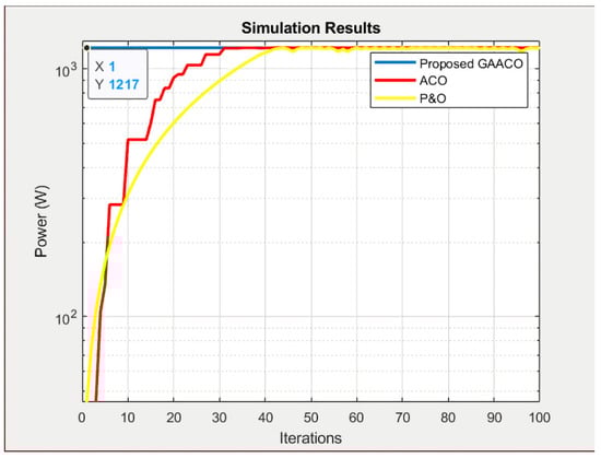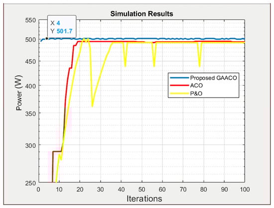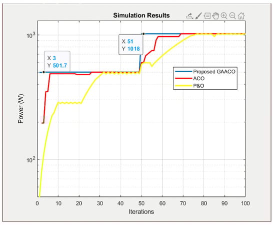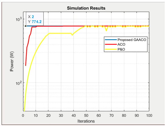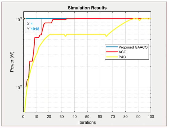 Figure 13 is the simulation results when the changing condition has occurred in the middle. The shading condition is changed from Case 4 to Case 2. The early condition (iteration 1–49) is when Case 4 has occurred to the PV modules. Therefore, the P–V curve of the early condition is the same as the Figure 11. Then, the other condition (iteration 50-100) is when Case 2 has occurred to the PV modules, which means that the P–V curve of the other condition is the same as the Figure 7. As shown in Figure 13, the performance of the proposed GA-ACO MPPT is still the fastest compared with the other two algorithms. In only three iterations, the proposed MPPT could reach the GMPP. In the changed condition (iteration 50–100), the proposed MPPT could reach the GMPP at the first iteration when the ACO MPPT reached the GMPP at the 19th iteration and P&O MPPT at the 27th iteration.