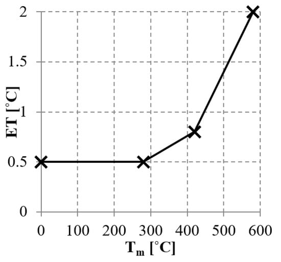 Experimental tests included the measurement of the gas temperature in the furnace and of the temperature inside the cylinder of diameter D = 100 mm, made of steel. Thermocouples were located on the radius r1* = 48 mm (at the distance g = 2 mm from the cylinder boundary in planes A1, A2 and A4). In plane A3, thermocouples were located on radii r1* = 44 mm, r2* = 46 mm and r3* = 48 mm. The thermocouple installation error was Δr = ±0.2 mm. Temperature was measured with the use of K-type thermocouples, nickel–chromium–nickel. The course of the error assumed for the experiment in temperature measurement ET was revealed by points determined during the calibration process and connected with straight lines (Figure 2).