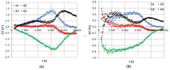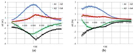 Similar results to those obtained for process p1 (Figure 6, Table 4) were achieved for processes p2 (Figure 7, Table 5) and p5 (Figure 8, Table 6). Process p1 was a reference process for the analysis of processes p2 and p5. In process p2, the heat flow through convection was more intensive than it was in process p1. It resulted from the fan setting, which was 50% of the maximum speed for process p1 and 100% for process p2. In plane A1, values of the absolute and relative difference were positive through most of the process. This meant that temperature in the plane A1 was higher than the mean value. This difference (10) reached up to 1.4 °C (Figure 7a, Table 5). At the end of the process (from time t = 8850 s), these values were negative (Figure 7a). This meant that only at the final stage of the heating process in plane A1 (the closest to the gas stream inflow) was temperature lower than the mean value calculated for the four planes under investigation.