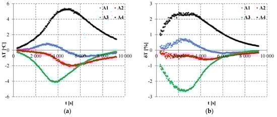 In heating process p1, values of the absolute difference and of the relative difference for temperature in planes A1 and A2 are positive, and in planes A3 and A4, they are negative (Figure 6). This means that in planes A1 and A2, values of temperature on the boundary were higher than the mean value (8), and in planes A3 and A4, they were lower. Based on dependencies from Figure 6, the following estimates for temperature were determined: