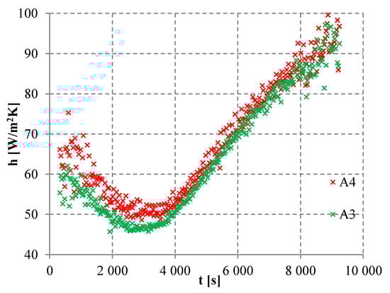 In process p5, the absolute (11) and relative differences (13), on average, took negative value in planes A1–A3 and a positive value in plane A4. It meant that at the ending part of the cylinder, the heat flow was intensified by gas backward swirl generated by the fan blades’ movements (estimates E1 (20) and E4 (23)). The difference between the HTC mean value and its value (11) in plane A1 reached up to 10.6 W/m2K. For other planes, these values were slightly lower and reached up to 10.0 (plane A4), 9.5 (plane A2) and 7.4 W/m2K (plane A3). The illustrative course of HTC in planes A3 and A4 for process p5 is presented in Figure 9.