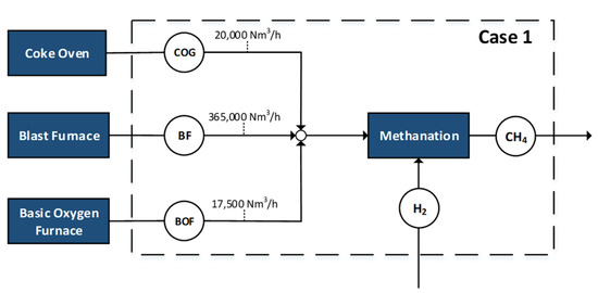 The first case represents the utilization of the entire available amount of the three off-gases for the production of methane. Renewable hydrogen is added in basic stoichiometric ratio to produce methane. This represents a boundary scenario for the utilization of the steelwork gases, which is restrictive in terms of hydrogen flows and electrolysis power requirements.