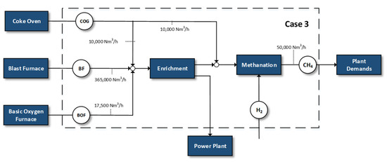 This case investigates the possibility of valorizing the steelworks off-gases for the replacement of the internal steelworks needs of natural gas—assuming an overestimated case of approximately 50,000 Nm3/h internal natural gas demands for a 6 MT/year steel plant [12]. The remaining portion of the gases is combusted in the power plant.