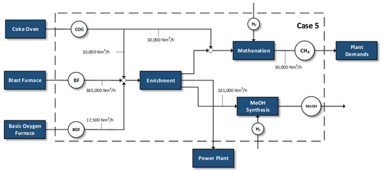 Case 5 represents the most integrated valorization scheme for steel gases for the simultaneous production of methane and methanol. After the enrichment step, half of the amount employed in Case 4 is used for methanol production and another part is used for the replacement of the industry’s natural gas demands. Finally, a part of the gases is sent to the power plant.