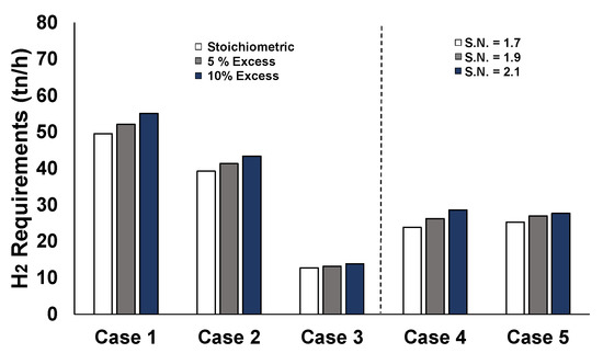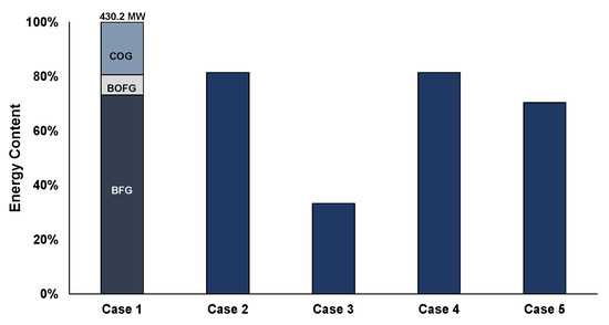 Figure 6 shows a comparison of the energy content of the mixed feedstock of Case 1 with respect to the energy content of the other cases, by highlighting the different off-gases contribution. In the first scenario, BFG comprises 73% of the total energy content of the feed stream to the syntheses processes, due to the larger used flowrate, whereas COG, although in lower quantity (20,000 Nm3/h compared to 365,000 Nm3/h of the BFG; 5% of the total amount) contains a significant portion of the overall energy content (19%). This indicates a higher energy content per m3, due to the contained CH4 and H2 and the lower CO2 and N2 contents in the COG feedstock. Regarding the energy contents of the feedstock used in the different scenarios, Cases 2 and 4 use the same feed quantities for the production of chemicals (81% of the energy compared to Case 1). Case 3 represents the feedstock energy content for the replacement of the natural gas demand of the plant, while Case 5 is a combined case for the replacement of natural gas as well as for methanol synthesis (33% and 70%, respectively).