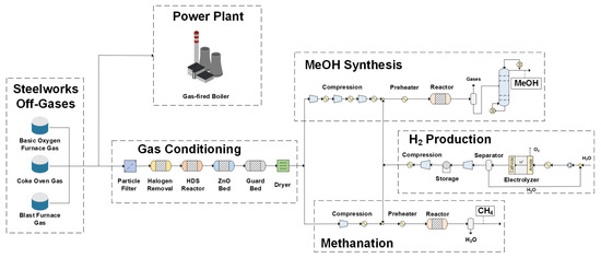 The three steelwork off-gases undergo different cleaning steps in order to remove the contained, unwanted components before being stored in gas holders. Typical gas cleaning steps involve dust removal, cooling, scrubbing (for ammonia and BTX removal), and demistering [19,25]. After the initial steps, additional gas cleaning is required to protect the methane [26] and methanol [27] syntheses catalysts.