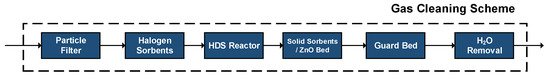 Regarding the sulfur-containing compounds, H2S is more easily removed at ppb levels with respect to other sulfur species. A common strategy consists in converting organic sulfur compounds to H2S and then employing adsorption technologies for the deep removal of H2S [32]. The avoidance of acid gas removal process, such as SelexolTM or RectisolTM, despite their efficiency in reducing H2S to ppm levels, lies within their affinity to physically absorb CO2, which should otherwise be used as feedstock for the production of methanol/methane [26].