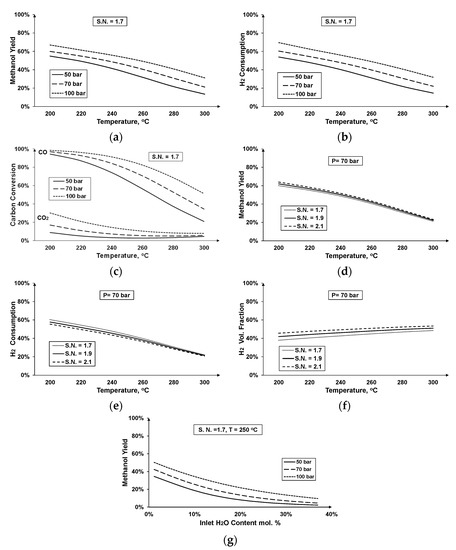 The most common MeOH catalyst employed in industrial scale is based on CuO/ZnO/Al2O3, which is also considered in this study. At higher synthesis temperatures, sintering could take place resulting in higher deactivation rate of the catalyst [41]. The produced water, mainly by CO2 hydrogenation, apart from affecting the equilibrium, could also adsorb on the catalyst sites and promote catalyst sintering [42]. In past works, in-situ water removal was proposed for the enhancement of the thermodynamic equilibrium concentration [43]. The methanol synthesis reaction is characterized by the stoichiometric number (S.N.) where [H2], [CO], and [CO2] refer to the molar flows of the feed components:. A value of S.N. = 2 refers to a stoichiometric correlation between the components, whereas the optimum case is slightly above the stoichiometric number [41].