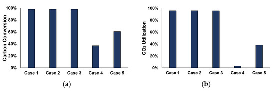The integration of methane and methanol synthesis is evaluated for the previously described scenarios considering a steelmaking plant of medium size with an annual steel production of about 6 MT. The different case scenarios are evaluated in terms of carbon conversion, product yields, hydrogen requirements and consumption, electrolysis demands, as well as overall efficiency of the process. For the cases where power is produced, it is assumed that a gas-fired boiler is in operation within the plant [16]. Figure 1, Figure 2, Figure 3, Figure 4 and Figure 5 depict the different flowrates and utilization factors of the steelworks off-gases.