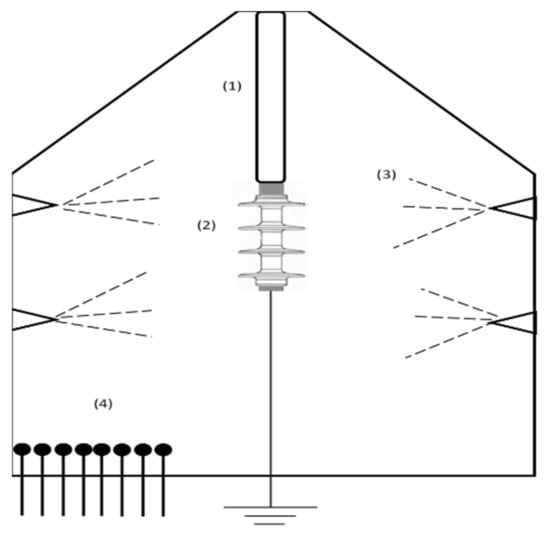 Schematic view of the fog chamber. (1) Voltage supply conductor, (2) Test insulator, (3) Nozzles, and (4) Fog control panel.