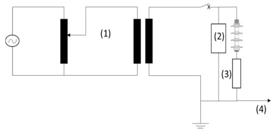 Diagram of the test circuit. (1) Voltage supply conductor, (2) Test insulator, (3) Shunt resistor, and (4) to DAQ system.